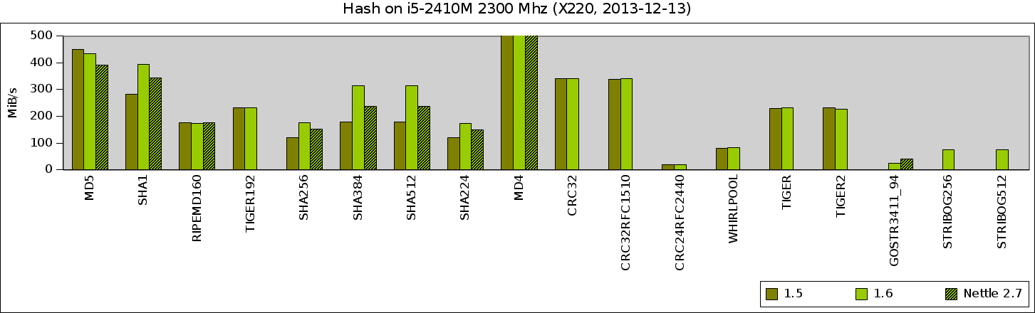The olive bars indicate how many bytes can be hashed by version 1.5.3, the green bar gives the figure for the new 1.6.0, and finally for some algorithms the hatched bar to what Nettle 2.7 is up to.